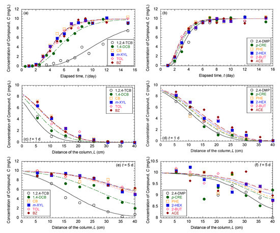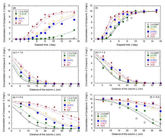 Comparison of the measured data versus fitted breakthrough curves and predicted concentration profiles of 12 organic compounds in mixture for simulated aquifer sands with foc of 0.051%: (a,b) are breakthrough curves, whereas (c,d) and (e,f) are concentration profiles at elapsed times of 1 day and 5 days, respectively.