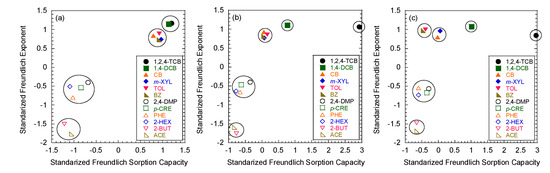 Two-dimensional configuration and cluster analysis of Freundlich sorption parameters of 12 organic compounds in mixture for simulated aquifer sands with different foc values: (a) untreated sand (foc = 0.006%), (b) HA-coated sand (foc = 0.051%), and (c) HA-coated sand (foc = 0.221%).