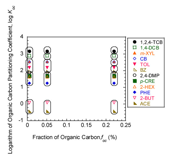 Accordingly, components for pseudocompounds in terms of simulated aquifer sands with different foc values are plotted versus log Koc for the organic compounds in mixtures in Figure 6. As shown in Figure 6, the reactive transport behavior of 12 organic compounds in mixtures to simulated aquifer sands with different foc can be lumped on the basis of log Koc. As the foc of simulated aquifer sands increased, the organic compounds with higher Koc (i.e., 1,2,4-TCB and 1,4-DCB) were split from nonpolar pseudocompounds due to the greater dependence of sorption on foc. In contrast, the organic compounds with lower Koc were not split noticeably due to the lower dependence of sorption on foc. Similar to the results from sorption to simulated aquifer sands in batch equilibrium sorption tests [1], log Koc can be used as the possible a priori grouping criterion for reactive transport of organic compounds in mixtures to simulated aquifer sands with different foc although the relative contributions of different forces (i.e., absorption vs. adsorption to HA domains, and adsorption onto hydrophilic mineral surfaces) to the overall sorption may differ for different mixture compositions and foc values during reactive transport through the soil column.
