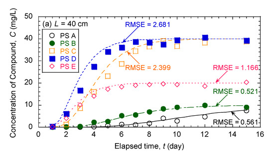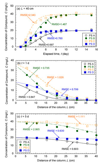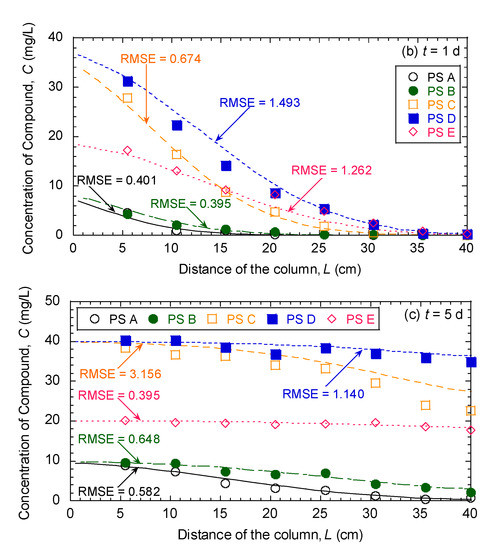Since the root-mean-square error (RMSE) is more appropriate to represent model performance than the mean absolute error (MAE) when the error distribution is expected to be Gaussian [21], the agreement between the experimentally measured concentrations according to the effluent/pore-water samples and the fitted (or predicted) concentrations estimated from MODFLOW-RT3D was evaluated in terms of the root-mean-square error (RMSE) defined as follows: