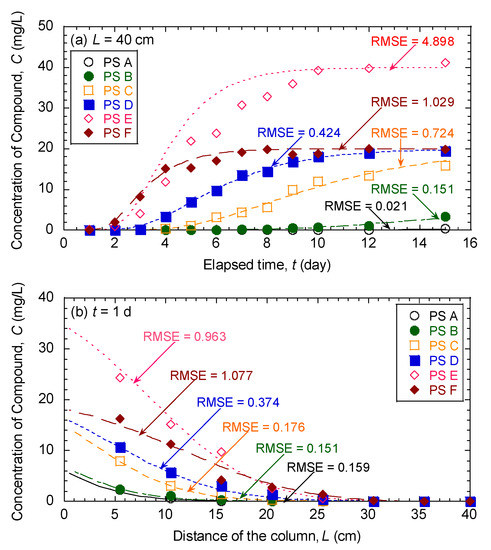 where C and S are the concentration of an organic compound in the aqueous phase (mg·L−1) and the solid phase (mg·kg−1), respectively, x is the longitudinal distance of transport (mm), t is the elapsed time (d), Dh is the hydrodynamic dispersion coefficient obtained from the results of the salt tracer (KCl) (mm2·day−1), vs is the average linear seepage velocity (mm·day−1), ρb is the bulk (dry) density (g·mL−1), and n is the total porosity. According to these considerations and Figure 1, the column was assumed to be initially free of any organic compound (C(x,0) = 0), a constant source concentration using injection wells was assumed for the upper boundary condition (C(0,t) = C0), and a zero concentration gradient using constant head was assumed for the lower boundary condition (∂C(L,t)/∂x = 0).