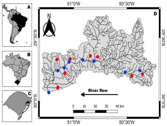 (A), South America; (B), Brazil; (C), Brazil´s southernmost state Rio Grande do Sul; (D), Sinos River basin. Blue dots = Raw water collection sites, red dots = drinking water collection sites in the residences. All residences were supplied with treated Sinos water.