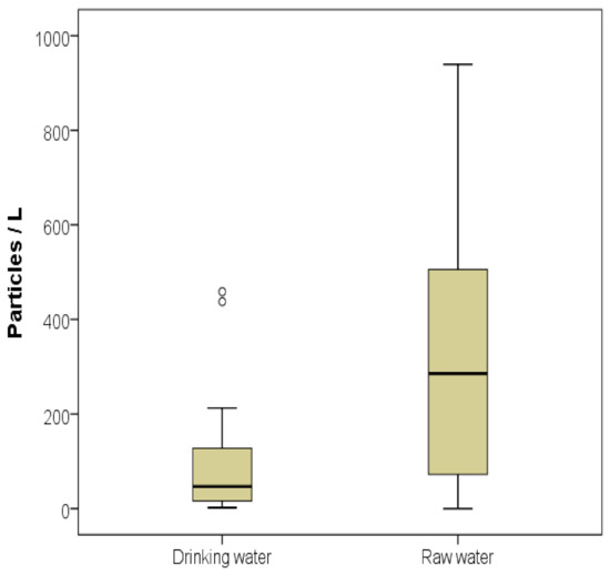Median concentrations of plastic particles in raw and drinking water were compared by the Mann-Whitney-U test, because data were not normally distributed (Shapiro–Wilk W = 0.81774, p < 0.001). The total sample size was 32, divided in 16 samples of raw water and 16 in drinking water, including the duplicates. The Kolmogorov–Smirnov test was used to compare the frequency distributions of fibers, pellets, and films in both sample categories. R software was used to process data [33].