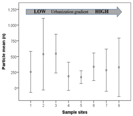 Mean particle concentration from two river water samples following the urbanization gradient of the Sinos River basin (low numbers = headwater sites; bars = standard deviation).