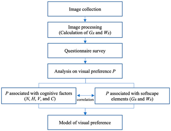 - We developed an empirical model of visual preference based on the relationship between visual preferences and four cognitive factors (Equation (3)). The evaluation results of the model are consistent with the results of the questionnaires and previous studies. When the four cognitive factors are factored in, the model determines the degree of visual preference.