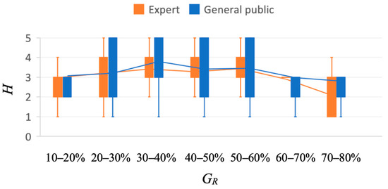 The relationship between harmony (H) and the percentage of visible greenery (GR) for the experts and general public.