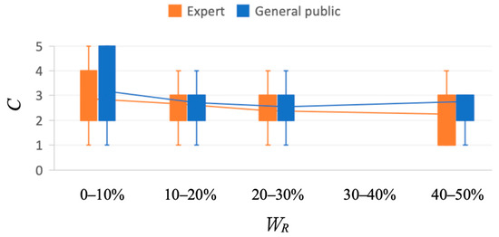 The percentage of visible water (WR) represents the proportion of water in each image. Figure 8, Figure 9, Figure 10 and Figure 11 show the relationship between WR and various cognitive factors. Among the four cognitive factors, naturalness (N) had a low association with WR. The N value trended upward as the WR value increased as long as WR < 20%, and it decreased slightly when WR > 20% (Figure 8). The value of harmony (H) trended upward slightly as WR increased when WR < 30%, and it decreased slightly as WR increased when WR > 30% (Figure 9). The vividness (V) had a positive association with WR in both the general public and the expert responses (Figure 10). The V value trended upward as the WR value increased. This result implies that vividness may be improved when the proportion of water flow in the image increases. Figure 11 shows that closeness (C) trended downward as WR increased. A high closeness value means that the viewer perceived the space as confined, cramped, or limited. This implies that increasing the visibility of the water may help reduce viewers’ negative perceptions of the closeness of the space.