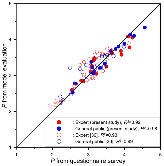 The second set of 106 questionnaires (the ones that were not used to develop the model) were used with the 16 images to verify the model. These 106 questionnaires were divided into an expert group (40) and a general public group (66). The mean values of P, H, N, V, and C of each image were determined from the questionnaires through statistical analysis. We were also able to evaluate the values of P using Equation (3) by factoring in the mean values of H, N, V, and C for an image. Figure 15 shows comparisons between the P values determined by the model (Equation (3)) and those obtained from the questionnaires. We also collected and compared previous study data [30] on P associated with perception factors and found 29 images of mountain stream-related engineering projects in Taiwan.