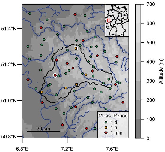 The used gauge stations are operated by two different institutions: the German Meteorological Service (ftp://ftp-cdc.dwd.de/climate_environment/CDC/observations_germany/climate) (DWD) and the Wupperverband (https://www.wupperverband.de/) (WV). The station properties are summarized in Table 1. Notably, the measuring intervals at the respective stations differ.
