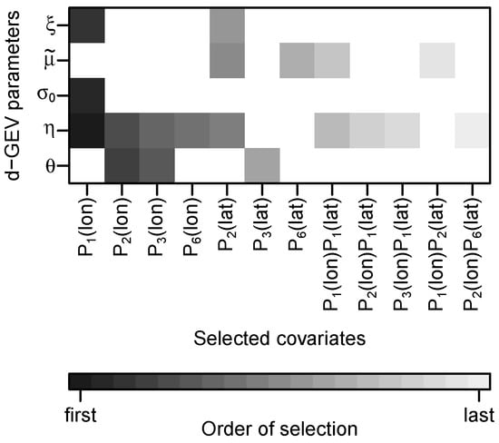 Choosing in Equation (11) as the maximum order of the orthogonal polynomials for modeling the five d-GEV parameters results in 48 terms in the predictor (covariates) and thus for the 5 parameters yielding possible models. Hence, the model selection is a challenging and also crucial task. We apply a step-wise forward regression, where we iteratively add one covariate to each of the parameters in a predefined order. If the addition of the covariate to the parameter model results in a better score, the model is augmented with this covariate. Since the d-GEV parameters are not independent of each other, the order in which the covariates are added strongly influences the result of the model selection. We chose the sequence , according to the order in which the parameters occur in Equations (5)–(7). However, this is just one of many possible options that could be considered. A more efficient strategy for model selection based on boosting [36] is currently under investigation for this use case.
