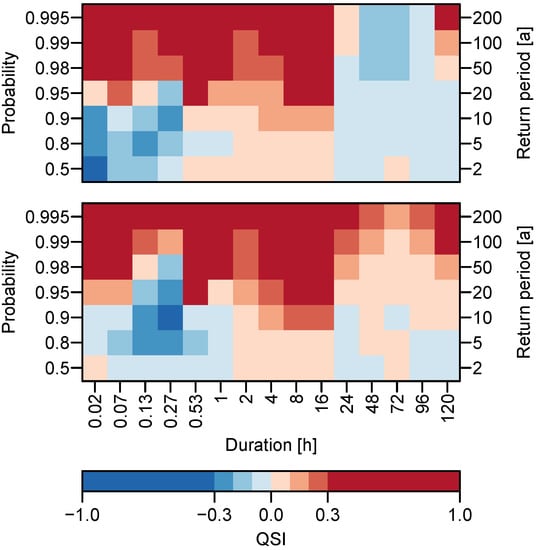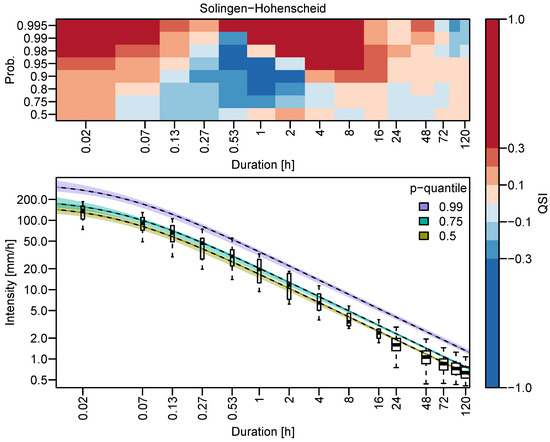 Since the QSI varies strongly between individual stations and individual durations, the assessment of the model performance and its presentation is challenging. However, the averaged QSI presented in Figure 3 allows for some conclusions. We find that the average QSI for the spatial d-GEV is strongly positive for upper quantiles (large non-exceedance probabilities ). From this, we conclude that the spatial d-GEV approach is an improvement for modeling rare events since it benefits from the increased data availability at neighboring sites. However, for a range of smaller durations min, the skill decreases for both the station-wise d-GEV and the spatial d-GEV model, compared to the reference which is based on an individual GEV for all stations and durations. This suggests that the d-GEV does not describe the variations in this range of small durations sufficiently well. Figure 8 presents the QSI together with the IDF estimates for gauge Solingen-Hohenscheid; this figure suggests that the negative QSI values in the range of min to h are related to an underestimation of the quantiles in this range. This supports the assumption that the d-GEV is not sufficiently flexible in this range and a more complex model might be necessary, as suggested in (e.g., [40]). Nevertheless, we only used time series with a maximum of 14 years to investigate the model performance for sub-hourly durations and thus cannot exclude the possibility that the effect may occur due to insufficient data.
