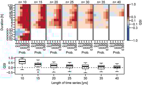 Advantage and disadvantage of the spatial d-GEV is represented through colors red and blue, respectively; white indicates a situation with insufficient data to evaluate . The two main features identified in Figure 3 recur: (i) an increase of with larger p for all and (ii) a disadvantage of the spatial d-GEV for durations h for a range of probabilities. Additionally, we observe a gradual decrease of the with . Leading to the advantage of the spatial model in modeling rare events becoming smaller in each step until the average QSI fluctuates around zero. This indicates that there is approximately the same number of stations with gain as with loss in skill. This approach therefore provides us with the length of the time series of a station, up to which it is beneficial to use the spatial d-GEV model, instead of a separate GEV model for each time series. As an example, the for is shown in Figure 4 in the lower panel as a boxplot for various . From this we can see that for there are about as many stations with the spatial d-GEV being superior as stations where it is inferior to the reference model.