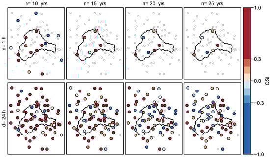 Quantile Skill Index for the spatial d-GEV approach with probability for durations h (upper panel) and h (lower panel) at all stations, for the number of training years (different columns). Colored dots indicate superiority of the spatial d-GEV (red) or inferiority (blue), while gray circles show stations without an estimate.