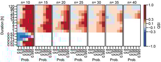 Moreover, the average QSI is lower for durations h. We believe this is due to a larger data availability for these durations and thus longer time series are available to train the reference model. This is supported by investigating the influence of time series length, where a fixed number of years is used to train the model for each duration and at each station (cf. Figure 4). We observe a gradual decrease in the average QSI with the length of the training time series. We conclude that the advantage of the spatial d-GEV model over the station-wise GEV model is reduced for longer time series; The pooling of information becomes less important. We find that for a length of about years, there are about as many stations with the spatial d-GEV being superior as stations where it is inferior to the reference model. This implies that in case of a single gauge with a long time series, the spatial d-GEV approach cannot outperform single site estimates for individual durations. However, due to the lack of data, we are unable to make any statements about the behavior of the estimates for h with . This information would be particularly helpful for these durations, as here often only short time series are available. Moreover, even with a strongly positive average QSI, negative values of the QSI for individual stations, and durations, occur. Yet, Fischer et al. [23] showed that even for long time series with more than 50 years of observations, a GEV model with spatial and seasonal covariates performed better than separate models for each month and station at almost all stations investigated. Therefore, the major improvement of the model by adding spatial and seasonal covariates is not directly applicable to the spatial d-GEV model.
