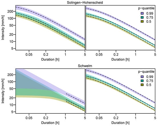 At station Solingen-Hohenscheid data is measured at one minute intervals and at station Schwelm at hourly intervals. As a result of the increased data availability the confidence intervals based only on the uncertainties of the parameter estimation are smaller for the spatial model than for the station-wise model. The spatial d-GEV is additionally able to estimate the quantiles even for durations smaller than the measurement interval, based on the data of neighboring stations with relatively low uncertainties. This information is not available using the station-wise model.