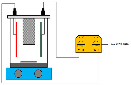 Electrocatalytic evaluation of the synthesized particle electrodes was conducted in a 700 mL cylindrical single compartment cell using Mersan DC (0–20 V ± 0.1 V) as the power supply (Istanbul, Turkey). RNO solution (in deionized (DI) water) was prepared with conductivity of ≈6 to 7 μS/cm, and no additional electrolytes were used for all experiments except otherwise mentioned. Electrochemical degradation using different particle electrodes was performed under constant stirring at ambient temperature (22 ± 1 °C), particle electrodes were added by considering the ratios of 1 mgcatalyst per mL of the feed solution. Electrochemical treatment experiments in 2D and 3D systems (with (3D) and without (2D) particle electrodes) were performed in a laboratory setup, as shown in Figure 1. The electrolytic cell was comprised of Nb/BDD anode and AISI 316 stainless steel cathode (Electrocell A/S, Tarm, Denmark) with submerged active electrode areas of 30 cm2 each and an electrode gap of 4.0 cm.