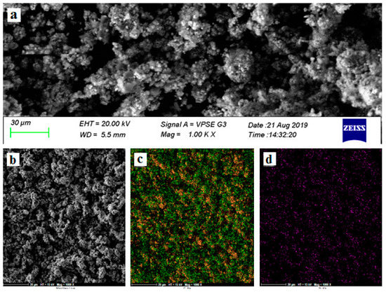 Morphological analysis of synthesized particle electrodes was performed by scanning electron microscopy (SEM) using a ZEISS instrument (Jena, Germany). Elemental analysis (EDS (Energy-dispersive X-ray spectroscopy) mapping) of synthesized particle electrodes was also investigated by Field-Emission Scanning Electron Microscopy (FESEM MIRA3, TESCAN, Brno, Czech Republic).