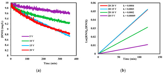 3.3. RNO Decolorization Versus Applied Cell Voltage