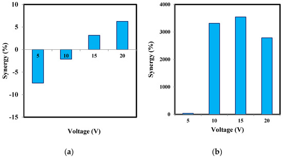 Making an overall comparison of the values obtained for the synergy parameter of synthesized NCPEs and GACs, the performance superiority of NCPEs to GACs was clear. As shown in Figure 5, the synergy parameter for the activated carbon catalyst was negative below 15 V. However, the synthesized catalyst exhibited the highest synergy parameter value at 5 volts. Moreover, although the synergy parameter in activated carbon increases with increasing voltage, such a trend was not observed for the synthesized catalyst. In other words, the synergy parameter value of the synthesized catalyst declined from 5 to 10 V and again slightly increased at 15 V and reached the minimal synergy value at 20 V, which is an opposite trend compared to the activated carbon with the highest synergy value attained at 20 V. By achieving the maximum synergistic effect at 5 V for the synthesized catalyst, one can discern that by improving the performance of the particle electrodes in the 3D system and by improving its electrochemical properties, it can further decrease electrical energy consumption.