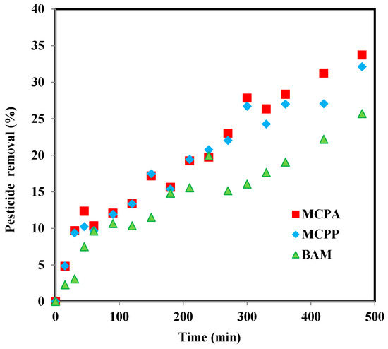 The removal of pesticides was completed in a three-dimensional electrochemical water treatment process in a solution containing three pesticide compounds, MCPP, MCPA, and BAM at the cell potential of 5 volts corresponding to the optimum synergy point. Pesticide removal at this voltage for MCPA, MCPP, and BAM reached 32%, 33%, and 27%, respectively, within the treatment time of 8h (Figure 6).