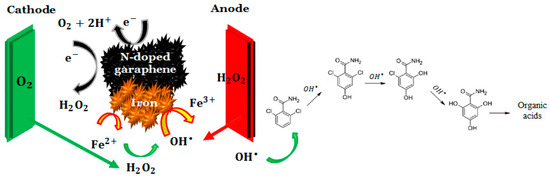 The presence of iron components in graphene-based catalysts on the other hand could promote the electro-Fenton (EF) process, which is important for hydroxyl radical production [43,44,45,46]. This can cause a significant increase in the synergy of the process. Therefore, the combination of carbon–iron [45,47] or nitrogen-doped carbon and iron species [19] are considered interesting to stimulate electro-oxidation and reduction processes, leading to a higher synergy parameter. As mentioned before, this higher synergy would increase efficiency, thus reducing the energy consumption and costs of the treatment process.