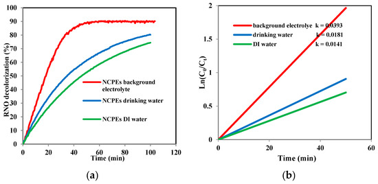 As seen in Figure 8, it was clear that the decolorization process occurred much faster in the case of using sodium sulfate as supporting electrolyte, and it reached up to 90% within only 50 min of treatment, while the corresponding level in DI water took 5 to 6 h. The rate of RNO decolorization in drinking water was also faster compared to that of DI water, but it was still slower than RNO decolorization with the supporting electrolyte.