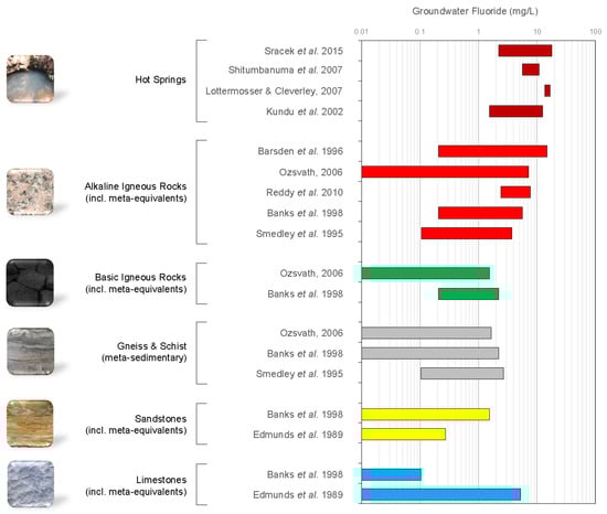 Summary of global data for groundwater fluoride concentration ranges and geogenic source. Hot springs represent deep hydrothermal groundwater fluoride source, all others represent shallow rock weathering groundwater fluoride source, sorted per lithology type (References for data: [10,27,28,29,30,31,32,33,34,35]; hot spring photo source: [36]).