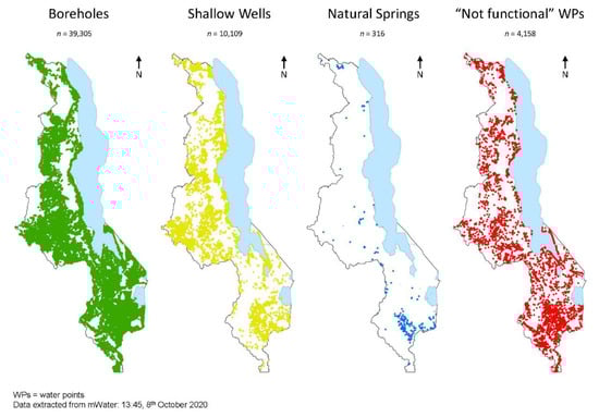 All water points included in this study. Only direct groundwater sources were considered (each water point type is represented separately). The data is representative of the time/date it was extracted from mWater (8 October 2020).