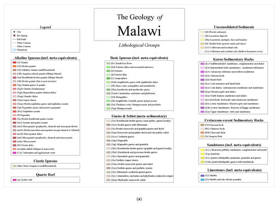 (a) Map legend and geological key for all maps, lithology organised per lithological group. (b) Full geological map of Malawi (digitised after others: [47,51], with Malawi’s location on the African continent inset. Map is divided into 10 separate maps with additional detail necessary to identify specific lithologies in the Supplementary Materials (Figures S1–S10).