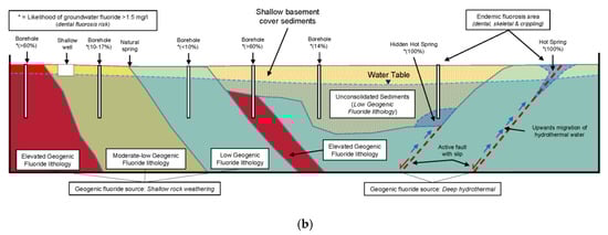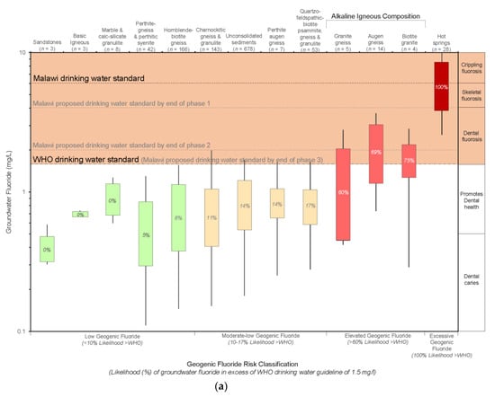 Rocks of alkaline igneous composition displayed the highest generic statistical likelihood (>60%) of encountering groundwater fluoride > 1.5 mg/L (Figure 4a) and were classified as ‘Elevated Geogenic Fluoride’. Granite gneiss, Augen gneiss (metamorphosed granite in this case) and Biotite granite have statistical likelihoods of 60%; 69% and 75% respectively. Even with low sample numbers for Granite gneiss and Biotite granite, these results are not surprising due to significantly higher ratios of fluoride-bearing minerals in granitoid rocks (Figure 1), relative to other rocks [6,10,23,24,25]. The ‘Elevated Geogenic Fluoride’ classification was thus extrapolated to the 19 remaining lithologies of alkaline igneous composition (Figure 3a).