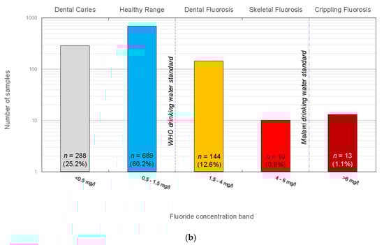 (a) Integrated graphic showing summarised statistical fluoride-lithology relationships for existing data. The percentage in each bar reflects the statistical likelihood of each source (lithology/hot spring) producing groundwater fluoride exceeding 1.5 mg/L. Sample numbers (n) are shown with lithology names. The figure shows the various health conditions associated with ingestion of fluoride and their corresponding fluoride concentration bands [10]. Horizontal lines display current and proposed fluoride drinking water standards. (b) Chart showing fluoride concentration bands and their respective proportion of the sample number from the data set. Y-axis has a logarithmic scale to expand data with low sample numbers.