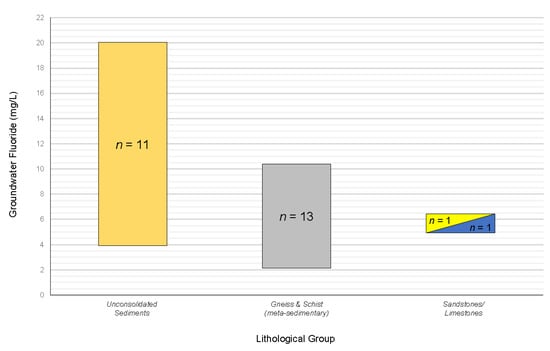 Groundwater fluoride concentration ranges for hot springs, split per lithological group from which they occur.