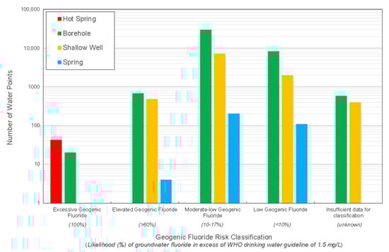Only “functional” and “partly functional but in need of repair”, direct groundwater abstraction sources were included (n = 49,730). ‘not functional’ water points (n = 4158) were calculated separately as they are continually repaired across the country, therefore, still represent a potential future risk if drawing groundwater from an elevated geogenic fluoride source (Figure 2).