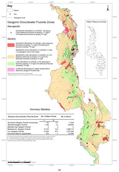 A national map of geogenic groundwater risk for Malawi was developed (presented later). The map was built in ArcGIS to display zones of statistical geogenic fluoride groundwater risk from shallow rock weathering sources (generic) and deep hydrothermal sources (site-specific-hot springs). In Malawi, water resources are managed at (surface water) catchment-level, so smaller-scale maps were developed for each major catchment, or ‘Water Resource Area’ (WRA) (Figures S11–S27—Supplementary Materials), to facilitate groundwater resource development planning for fluoride by the Government. These maps also demonstrate the ability of our approach to be adapted to any scale.