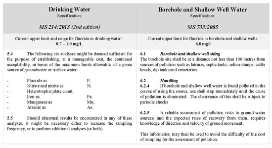 Summary of fluoride-relevant information from Malawi standard documents for drinking water and borehole and shallow well water [13,57].