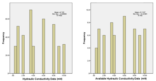 Figure 3 shows the histograms for all the hydraulic conductivity data and for the “available” data. It is noticeable that for larger values of the available data, the frequency bars are higher with respect to the others when compared to the former histogram. In addition, for the “available” data histogram the most frequent value is 6 m/day, meanwhile a value of 3.5 m/day corresponds to the histogram for all the data. These characteristics of the variograms are reflected in the mean value which is larger for the “available” data.