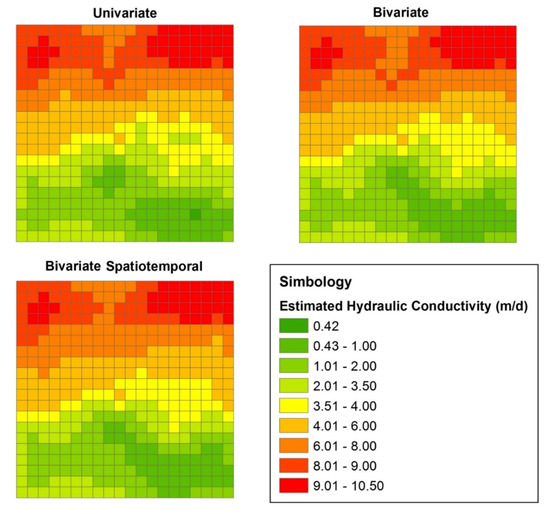 In Figure 4, a similar pattern can be seen for the three estimation methods; as expected, the different zones of hydraulic conductivity are not delineated as in the model due to the fact that estimates are weighed values of the “available” data, resulting in intermediate values for hydraulic conductivity estimates. This also explains that the central part is poorly reproduced due to the influence of the contrasting values of the data at the northern and the southern part of the model. The bivariate and bivariate spatiotemporal estimations better reflect the northern part of the model corresponding to the largest values; on the other hand the univariate estimation reflects better the southern part with the smallest values. The bivariate case presented in Figure 4, Figure 5 and Figure 6 corresponds to the use of the “available” hydraulic conductivity data and the first year of hydraulic head data.