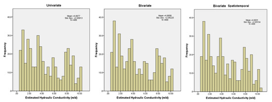 The histograms (Figure 5) show that the largest values of frequency for the hydraulic conductivity (K) estimates are lower than those of hydraulic conductivity data of the model, in the former more different values are obtained (intermediate values between the model data); therefore, these new values correspond to new bars in the histogram. Large estimates trend seems to be well represented; however, low values (<4) present higher relative frequencies when compared to the hydraulic conductivity data of the model. All the cases produce the highest frequency for some estimates of low values which do not correspond to original data; bivariate cases reach highest peaks for frequencies of estimates with low values. The mean and standard deviation values for estimates are closer to those corresponding to all the hydraulic conductivity data of the model than to the same statistics of the “available” data employed in the estimation.