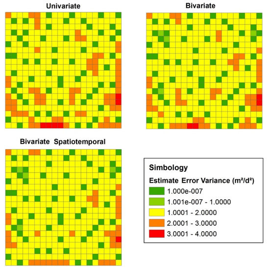 Furthermore, Figure 6 shows that even though errors in the case study are lower for the univariate case, a reduction in estimation uncertainty (expressed with the estimate error variance) is gained for the bivariate cases. In particular, the bivariate spatiotemporal case reduces the most this uncertainty. There is a general trend of a higher estimate uncertainty at the southern region of the model, corresponding to the smallest values of hydraulic conductivity. The values of the SMSE for the bivariate cases (closer to one) along with their respective lower estimate error variances validate a bigger robustness and confidence for these estimation methods when compared to the univariate case; in other words, a lower overestimation of the estimate error variance is reached. In this sense, with respect to these measurements, the best results are obtained for the bivariate spatiotemporal case.