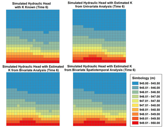 For the bivariate estimation, the hydraulic conductivity (K) is estimated using the 60 “available” hydraulic conductivity data and 400 hydraulic head data for a selected time; in the case study, six different estimates were obtained since hydraulic head data for six different times were available.