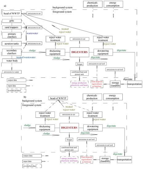 The two FUs were coupled with the system expansion approach (the alternative production of energy and fertilizers) and adopted to evaluate the environmental burden of AD at both scales, the whole WWTP (to assess the contribution of the sludge line to the whole WWTP) and the sludge line alone (to highlight the potential environmental benefits from methane production as an additional function of the system beyond the wastewater treatment). The application of two FUs would demonstrate a deeper, more comprehensive and more transparent picture of AD implementation at the sludge line and at the WWTP. Thus, applying the two FUs helps to present the environmental profile of each AD from different points of view [4,27].