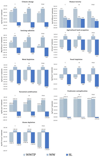 The rest of the impact categories (i.e., Ionizing radiation, Agricultural land occupation, Metal and Fossil depletion, Terrestrial acidification, Freshwater eutrophication, and Ozone depletion) follow a similar pattern. For all SL-LCA scenarios, the overall result can be referred as avoided impacts, with the best results being obtained for T, followed by M, and finally by TPAD. The main contributors are Sludge disposal and Electricity, and the WWTP load to a lower extent (with a maximum of 20% for Terrestrial acidification and lesser for other impact categories).