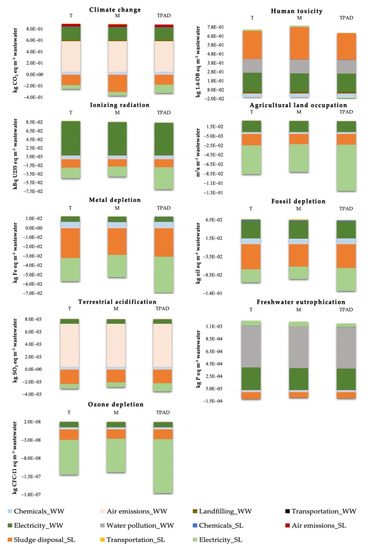With regard to the factors that contributed the most to the environmental impact of Climate change, those emissions to the air (Air emissions_WW) and from the energy demand (Electricity_WW) in the wastewater treatment line are the most significant ones (i.e., around 60% and 25%, respectively, of all contributors from the wastewater treatment line). The contribution from the emissions to the air in the sludge line (Air emissions_SL) are only 5% (Figure 3). Hence, the total environmental impact was partly compensated by land application as the final sludge disposal (Sludge disposal_SL) and energy produced from the methane (Electricity_SL) obtained during AD with the following percentage of these two factor contributions, respectively: 72% and 28% for T, 82% and 18% for M, and 54% and 46% for TPAD. The balance of these two factors for TPAD shows better long-term performance of this AD technology.
