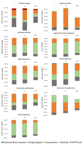 In the case of specific impact categories, the avoided environmental impacts in Climate change for both T and M are larger than those of TPAD by 24% and 38%, respectively—Figure 4. The only factor causing environmental impacts on Climate change for the three scenarios are the gaseous emissions from AD installations (Air emissions). On the contrary, the avoided environmental impacts have been credited by the following factors: additional reject water treatment (WWTP load concerning each scenario: 53% for T, 40% for M, and 47% for TPAD), final sludge disposal (Sludge disposal: 34% for T, 49% for M, and 29% for TPAD) and energy production (Electricity: 13% for T, 11% for M, and 24% for TPAD). Further minor avoided impacts are related to chemical consumption (Chemicals) (around 10% for all AD types) and transportation (Transportation) (around 5% for T and TPAD, and around 11% for M due to longer distance—a round trip—to the composting site).