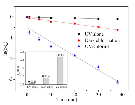 The degradation of AML under three process conditions was compared, including UV irradiation alone (254 nm), dark chlorination, and the UV/chlorine process. As shown in Figure 1, only 8.8% of AML was removed by UV irradiation alone and 41.2% AML was removed by dark chlorination. However, the removal of AML reached 96.8% by the UV/chlorine process after 38 min. It is obvious that the UV/chlorine process evidently improved AML degradation efficiency compared with UV alone and dark chlorination. All the fitted curves between ln(ct/c0) and time retained linear relationship which means that these degradation reactions are suitable for pseudo-first-order kinetics (Equations (2) and (3)), with degradation rate constants () of 0.0159, 0.0207, and 0.0680 min−1, respectively: