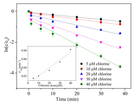 Furthermore, Figure 2 shows that the chlorine dose and the degradation rate constant exhibited a significant linear relationship (, R2 = 0.9668). The effect of the chlorine dose was also similarly observed in diuron degradation by the UV/chlorine process [30].