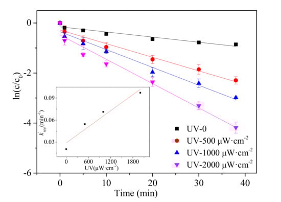 All the test results were successfully fitted with pseudo-first-order reaction kinetics (R2 > 0.93). As shown in Figure 3, as the UV intensity increased from 0 to 2000 µW·cm−2, apparently improved from 0.0205 to 0.0973 min−1. According to Equation (7) [32,33], is related to the UV intensity (I) and quantum yields of AML, HOCl and OCl−. However, AML was barely degraded by UV photolysis, so the quantum yield of AML was negligible. In addition, the quantum yields of HOCl and OCl− remain constant under different UV intensities [17]. Therefore, AML degradation was directly affected by the UV intensity, and the degradation of AML was enhanced with increasing of UV intensity.