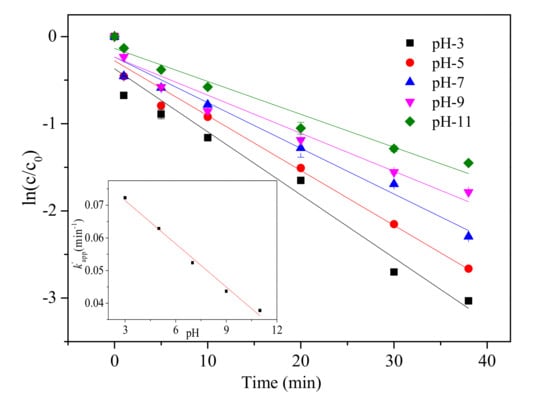 Kinetic tests were carried out in the photoreactor described above. HCl, NaOH, and 10 mM phosphate buffer were used to maintain or adjust the pH value of the solution. A PHS-3C acidometer (REX, Shanghai, China) was used to determine the pH value.