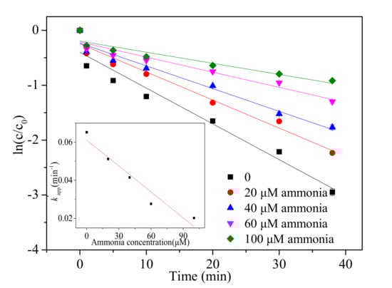 Ammonia (NH4+) is an important parameter that affects the water environment, so the effect of the ammonia concentration on AML degradation was also studied. The other conditions were as follows: 10 μM initial AML concentration, 30 μM chlorine dose, 500 μW·cm−2 UV light intensity, and a pH value of 7.