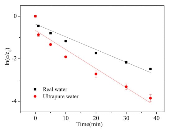 AML degradation in real water was studied and compared with that in ultrapure water to evaluate the effect of background matter. The total phosphorus, COD, ammonia nitrogen and dissolved oxygen of real water were 0.39, 8.07, 0.62 and 5.89 mg·L−1, respectively (Table A1). The initial concentration of AML was 10 μM under both conditions.